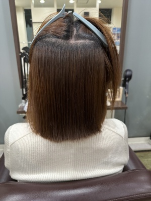 今回は毛先ダメージヨレはありますが縮毛矯正は残ってましたので根本は縮毛矯正、毛先はトリートメントで少し切って毛量減らしました。