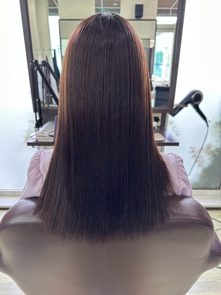 毛先の体力はあったから毛先まで掛け直してより真っ直ぐでピカピカにするのと悩みましたが全然綺麗に縮毛矯正残ってましたのでトリートメント処理でケアしました。