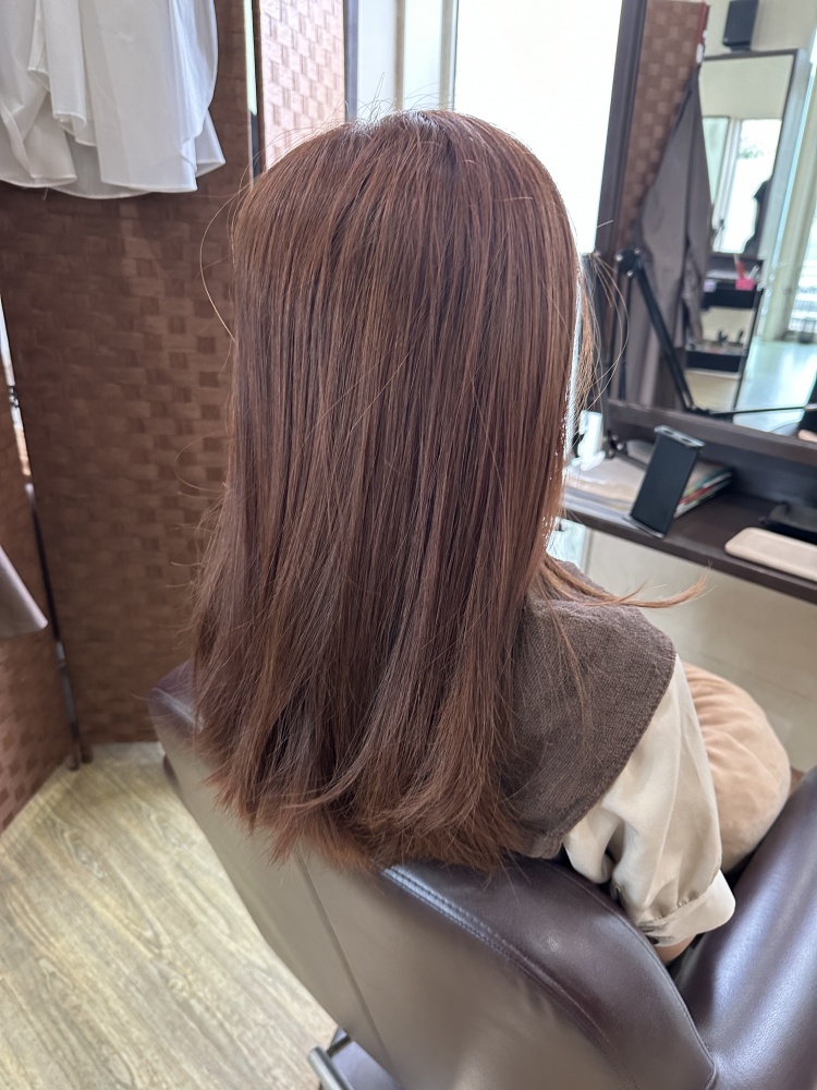 髪質はしっかりしてますがセルフカラー履歴が結構強めでダメージはしっかりしております、薬剤選定は今回悩みましたがやや強めと弱めとトリートメントの3種類を塗り分けて対応して参ります。お顔周りはプラス毎日のアイロンがあるのでより繊細に。