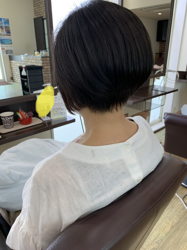 ハンドドライざっくりさざざ〜、と乾かしても綺麗にまとまる縮毛矯正とカット、カットはやや前下がりなショートボブ〜グラデーションボブです。