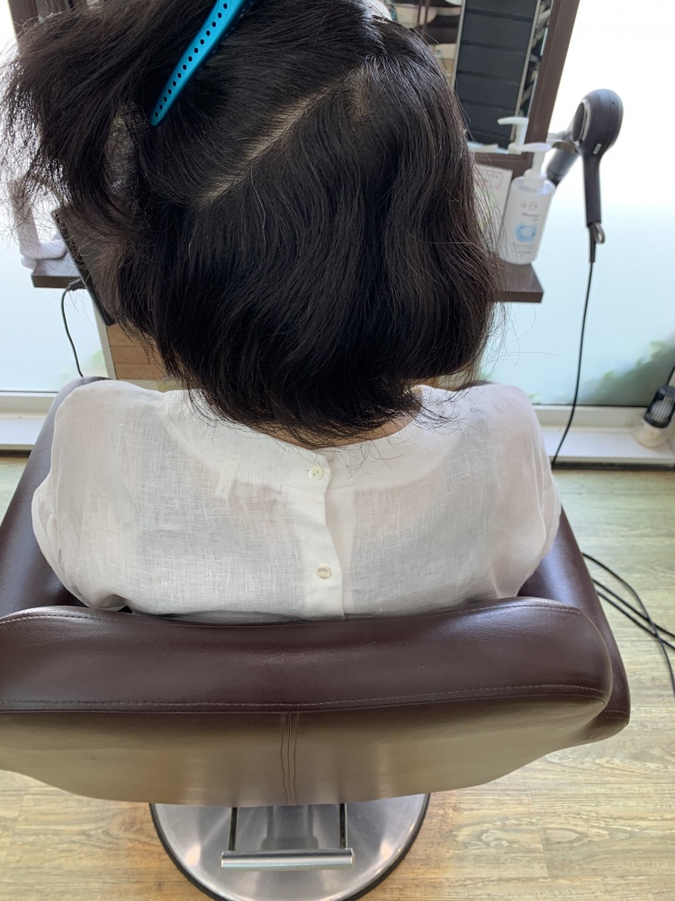 癖っ毛はしっかり伸ばしますが伸ばすのに集中し過ぎるとペタンコになり気味なので上手くアイロン入れてから丸み意識で施術して参ります。