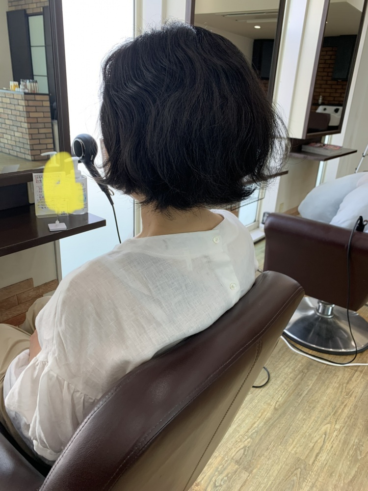 癖っ毛強めのお客様、ショートカットにすると形は良い感じになりますが癖っ毛さんで広がったり膨張したりでなかやか思うようにならないとのこと。