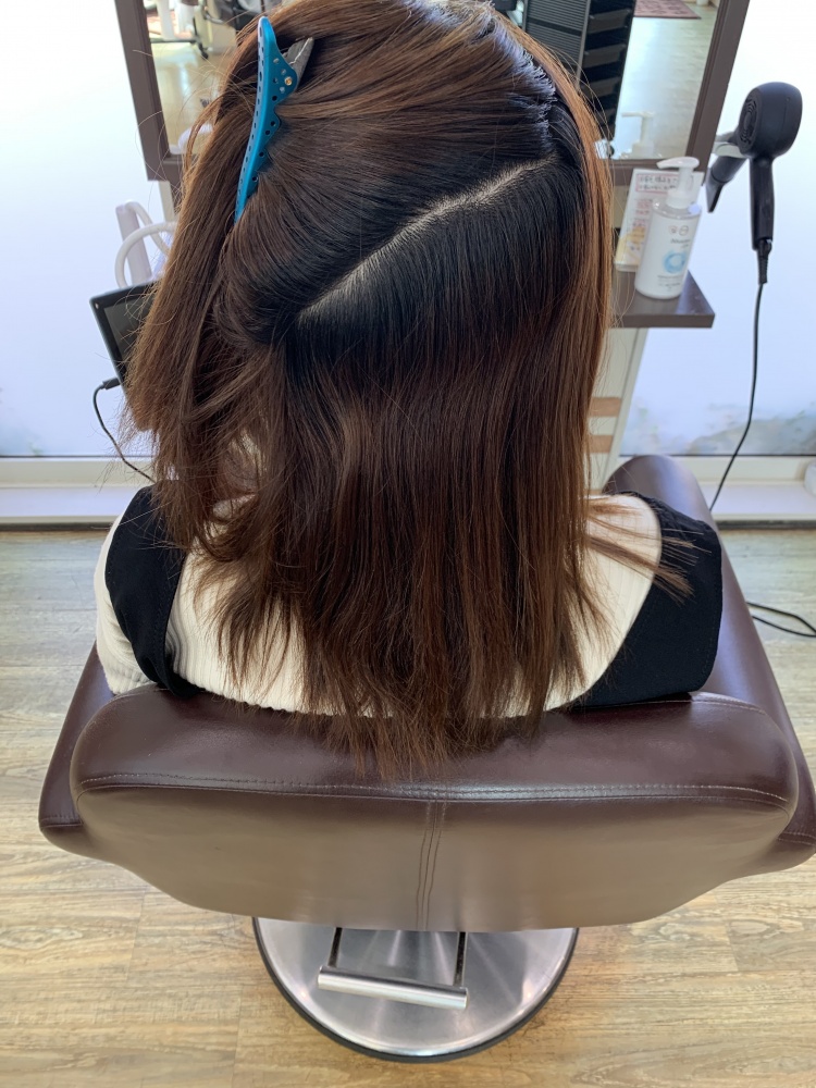 薬剤選定は弱め薬剤をタイム長め、アイロンワークは1発で決めるイメージで。これは鉄板で大体良い感じになります笑。細毛さんのチリつき出る人は薬剤強くてアイロンで焼いてるがほとんどのケースと感じますね、あと薬剤の種類が細毛やエイジング毛(この方はエイジングはない)に合ってないかもです、チオ乳酸とかスピエラとかシスとかがなんか使いやすかったです(個人的に)